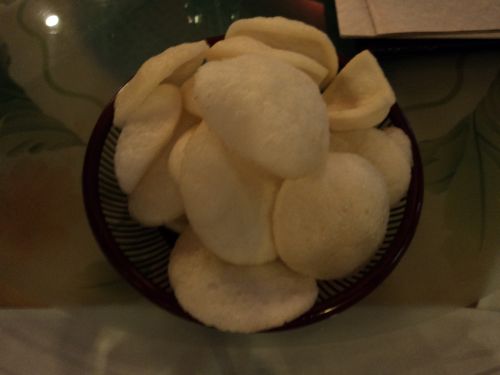 อุปกรณ์เช่นเคย วันนี้เลือกชาร้อนค่ะ นั่งปุ๊บก็เสิร์ฟออเดิฟปั๊บ เป็นข้าวเกรียบทอดค่ะ (อร่อยแฮะ)