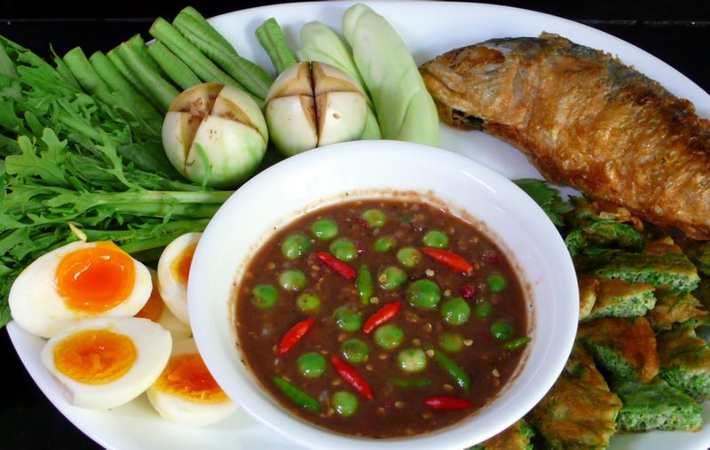 - ผักสดต่างๆ เช่น แตงกวา ถั่วฝักยาว มะเขือ สด หรือ ต้ม