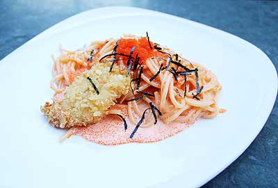 สปาเก็ตตี้ไข่กุ้ง (215 บาท) ทางร้านนำเส้นสปาเก็ตตี้มาผัดคลุกกับไข่กุ้ง โรยหน้าด้วยไข่กุ้งและเส้นสาหร่าย แล้วมีกุ้งชุบแป้งทอดใส่มาด้วย ม้วนเส้นสปาเก็ตตี้เข้าปากเคี้ยวเด้งนุ่มรสชาติละมุนกลมกล่อม เคี้ยวไข่กุ้งกรึบๆ ปากและกุ้งทอดกรอบนอกนุ่มใน